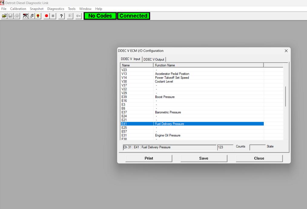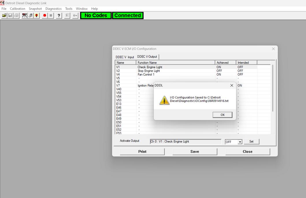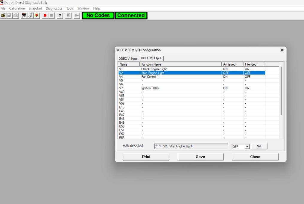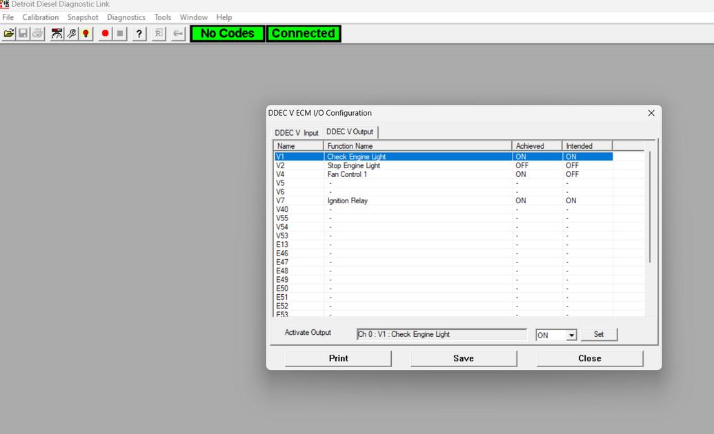 DDEC V ECM I/O Configuration is a diagnostic function in Detroit Diesel Diagnostic Link (DDDL). It allows technicians to monitor ECM inputs and temporarily activate outputs when connected to a DDEC V engine.