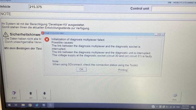 I bought Car MB Star Diagnostic Software Installed 256G SSD from OBDIISHOP , but when I try to diagnose my 55 amg it says broken cable from the multiplexer to diagnose unit.